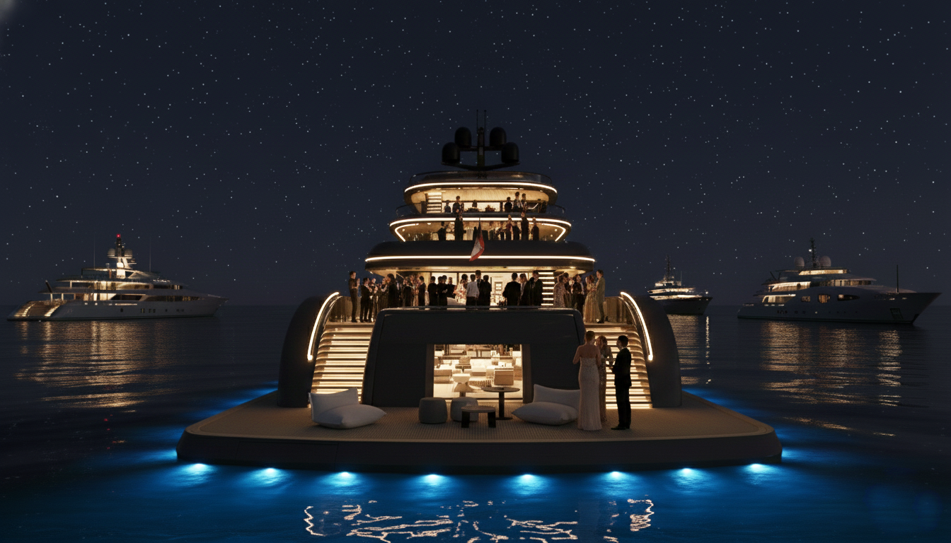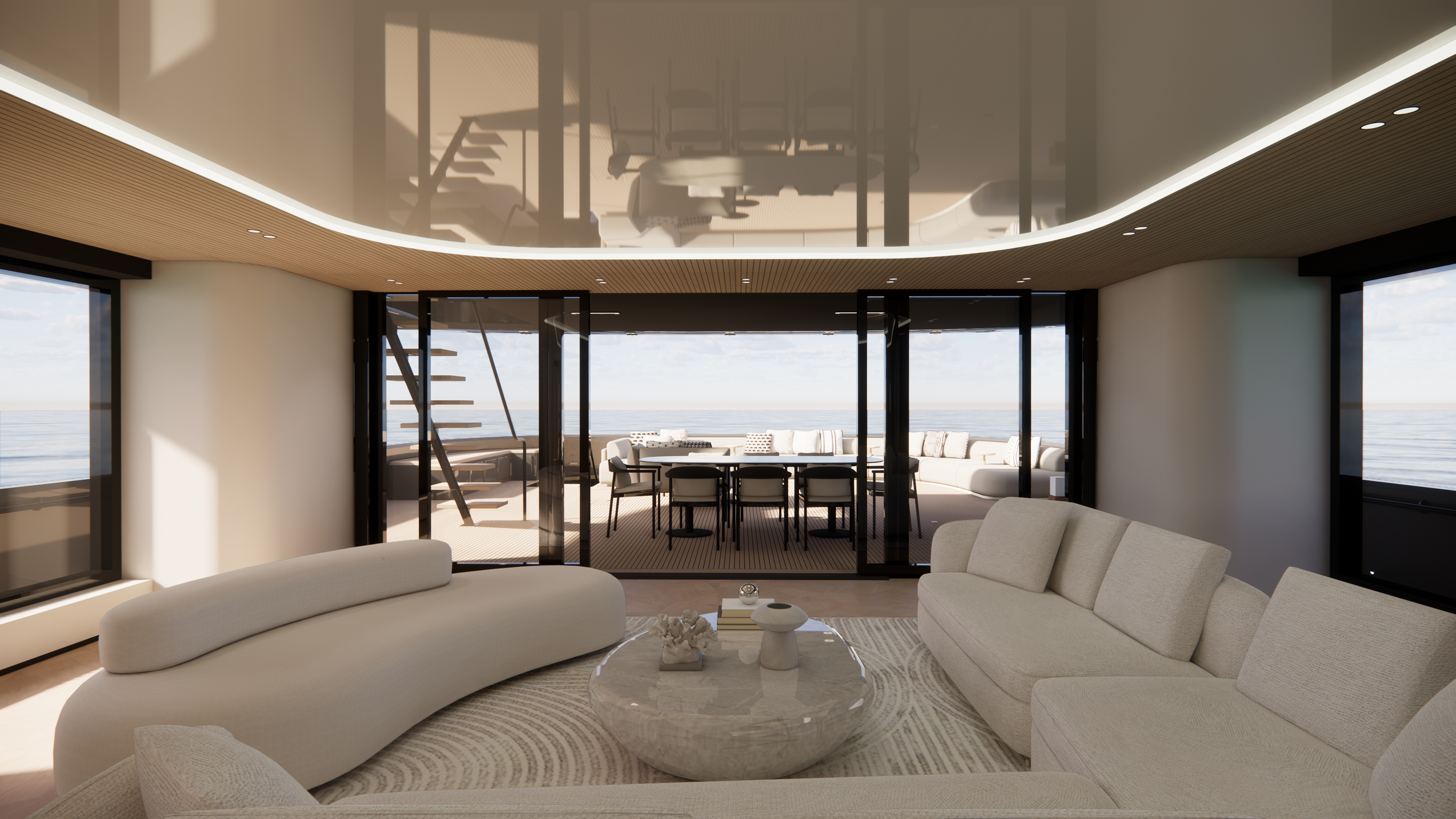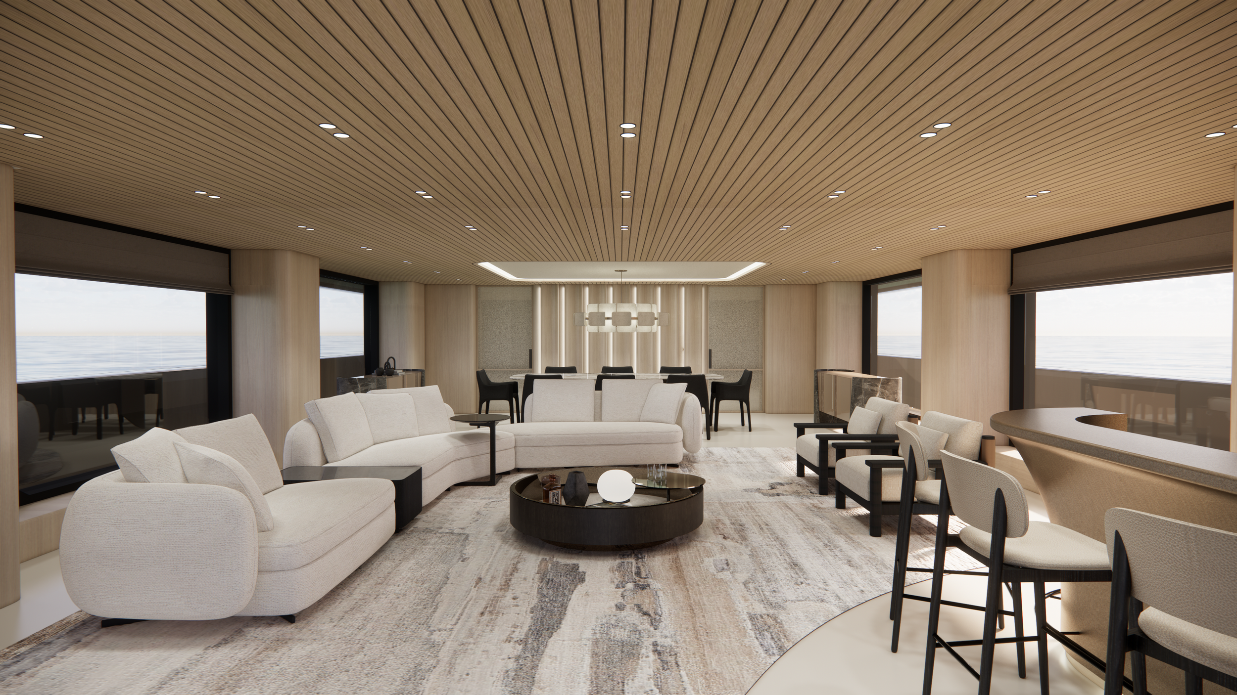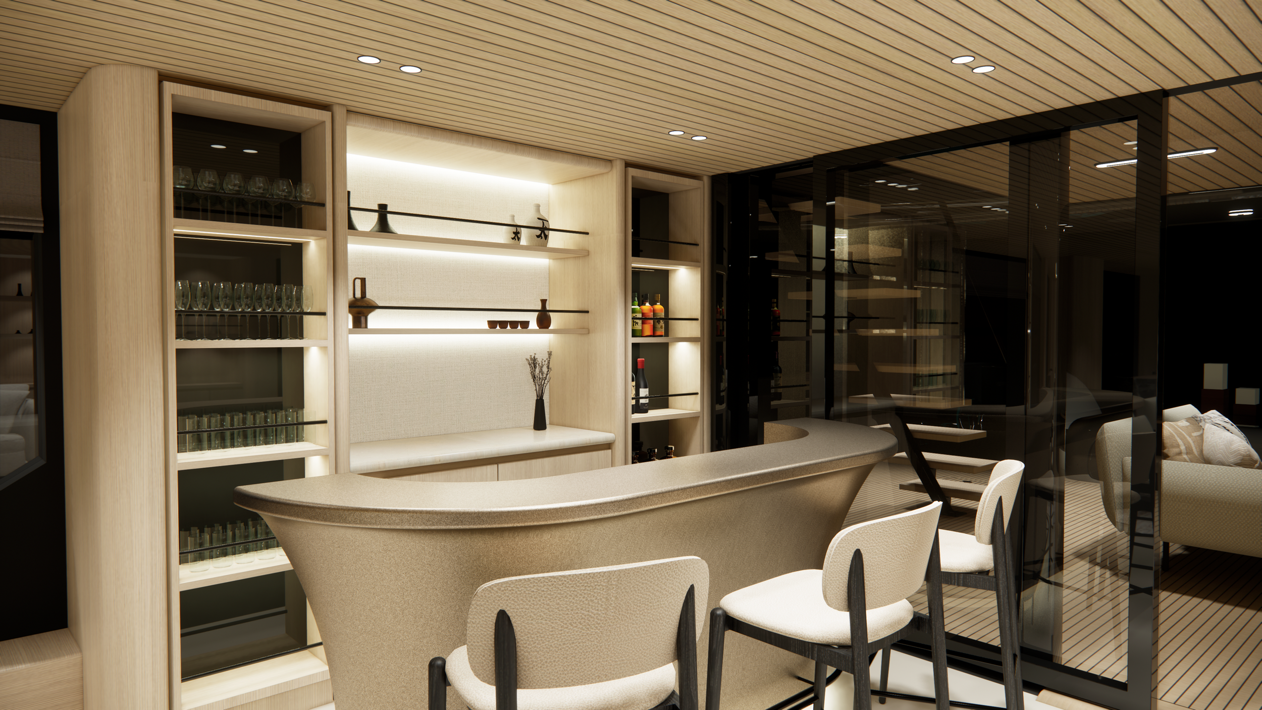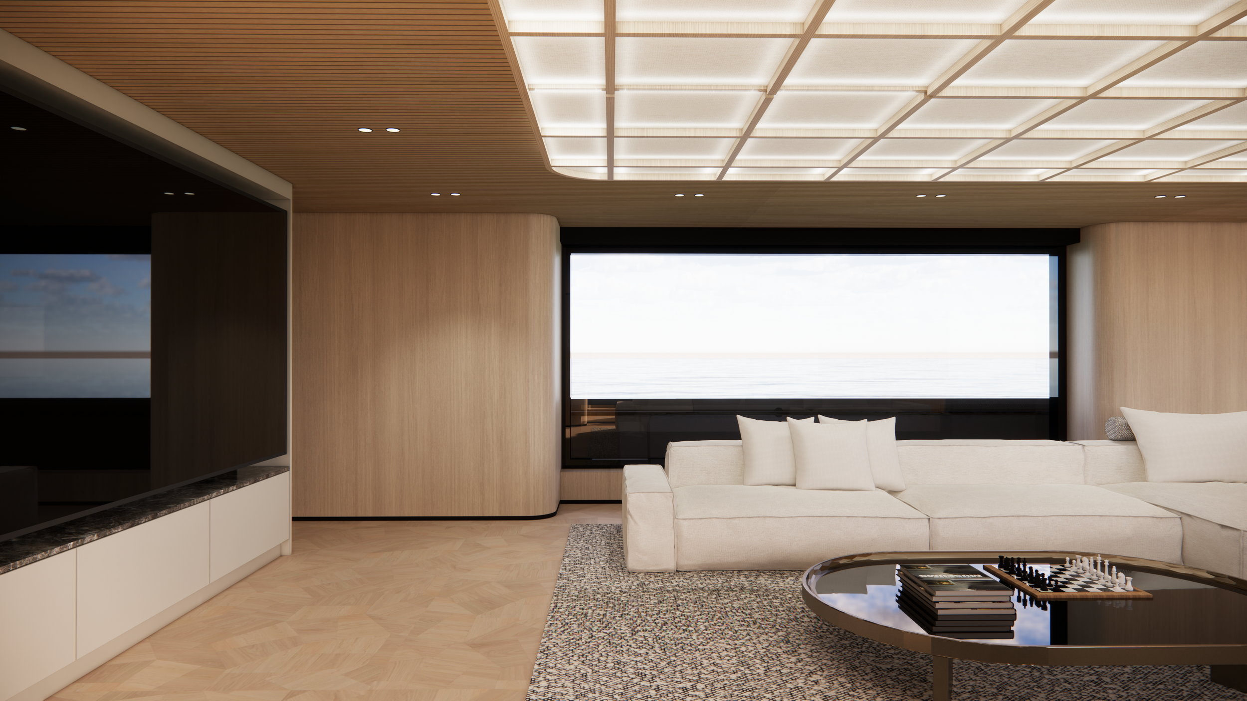 The LED digital wall adds an immersive layer: its gentle, programmable glow can mimic dawn, dusk, or the soft reflection of waves, quietly shifting the mood without ever overpowering the simplicity. The overall result is a serene transition space that feels alive yet understated, perfectly in tune with life at sea.