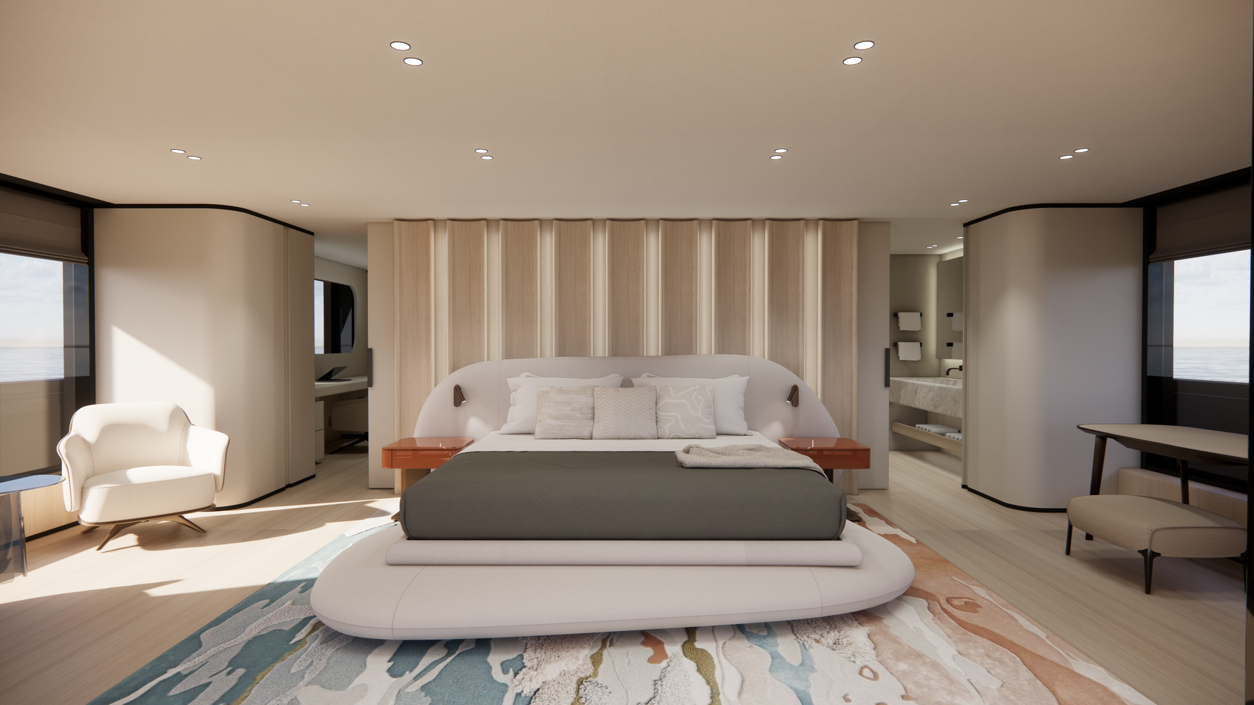 This master suite exudes serene contemporary elegance with fluid organic curves and a soothing neutral palette. The sculptural cocoon-like bed, featuring a rounded headboard and wave-inspired platform, sits as the center piece, framed by vertical light-wood slats that evoke gentle ocean swells. Floor-to-ceiling glazing bathes the space in natural light and panoramic sea views, while subtle recessed lighting creates a tranquil ambiance. Warm walnut accents, a vibrant abstract rug in oceanic tones, and curved architectural elements ensure effortless flow and luxurious privacy.