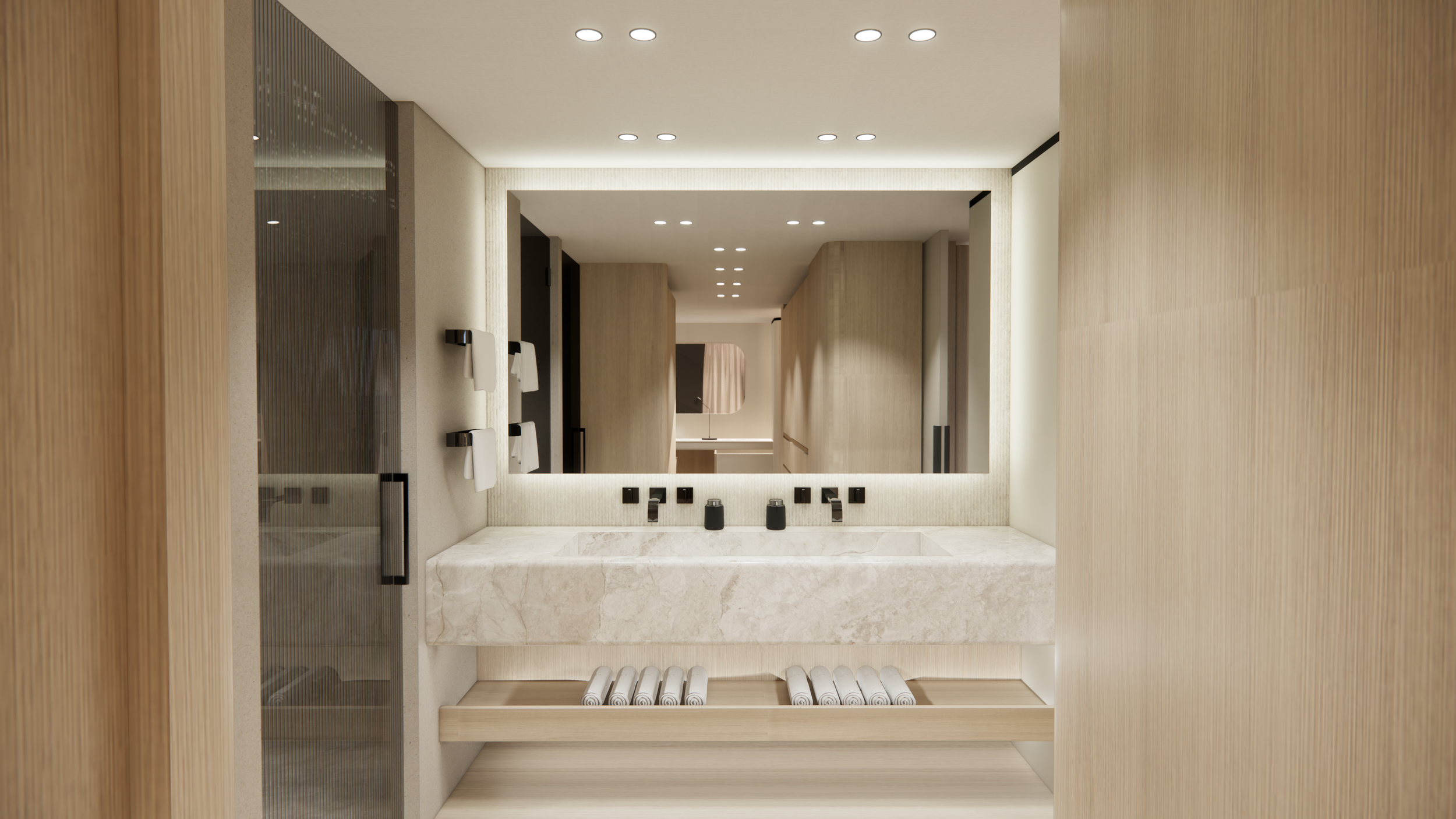 The master suite bathroom radiates gentle softness through carefully selected finishes: warm beige textured walls, smooth light oak paneling, and a luxurious honed marble vanity that invite touch and calm. This tactile serenity is elevated by soft, diffused recessed ceiling lighting and a fully backlit mirror, which bathe the space in even, flattering illumination—creating an enveloping, spa-like glow that enhances every subtle texture and curve, perfectly complementing the superyacht's understated elegance.