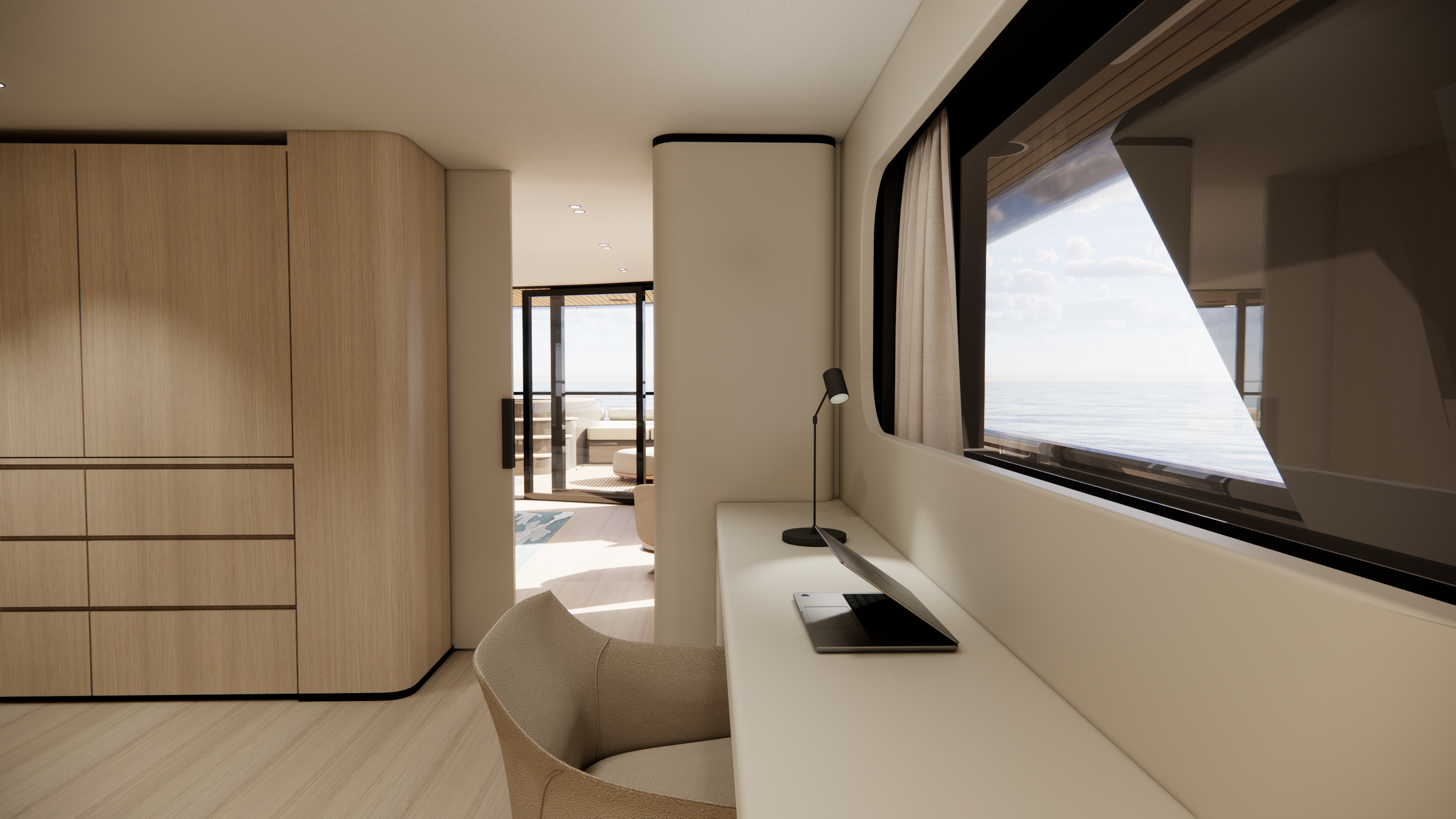 The dressing room and desk area adjacent to the master suite feature soft neutral tones—beige, warm oak, and creamy taupe—with tactile, matte-finished woods and gentle curves for a calm, luxurious feel. Sliding panel doors allow seamless connection to the suite or complete privacy, while the panoramic window frames stunning ocean views, creating a refined, tranquil retreat at sea.