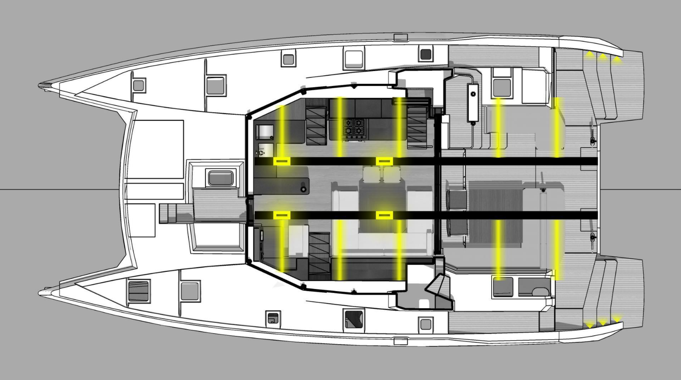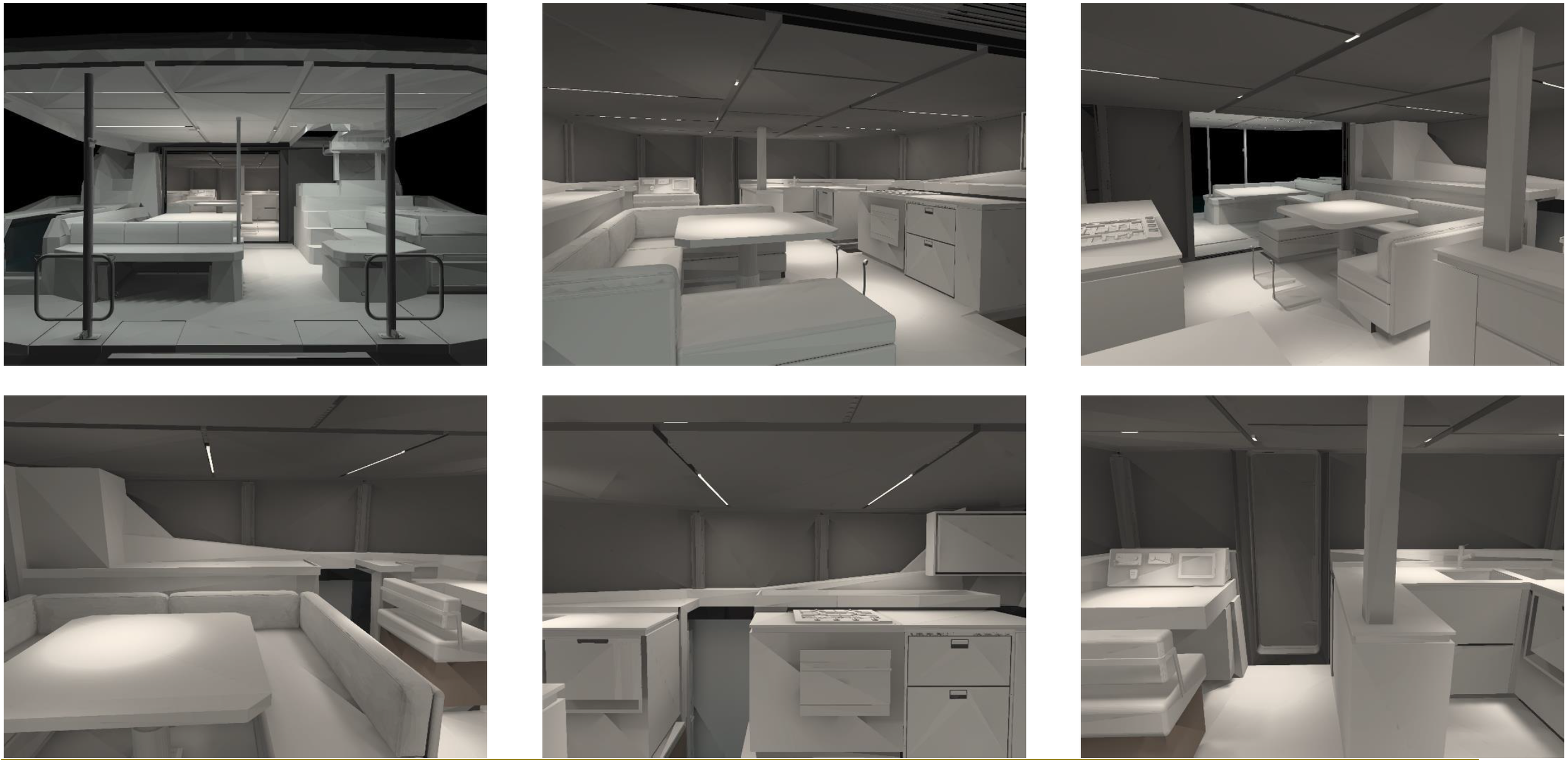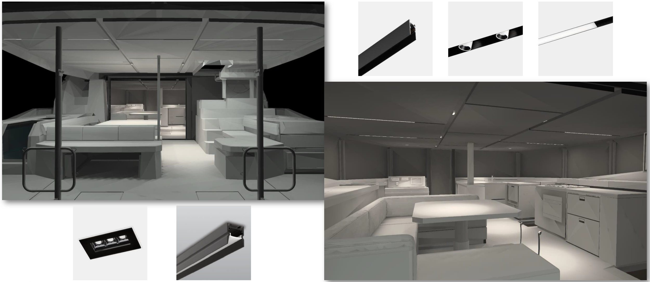 In the yacht interior design process, lighting is integrated early to both respond to and inform the architecture, space planning, and onboard experience. Tailored lighting designs are done that highlight key features with vertical accents, provide even ambient light via linear LEDs along corridors and divisions, deliver glare-free task lighting in functional areas, and add warmth and depth through subtle uplighting and wall-washing in cabins. This includes full layouts, intuitive switching with scene control, precise light level calculations, and marine-grade fittings selected to achieve the desired effect—whether dramatic, functional, or serene.
